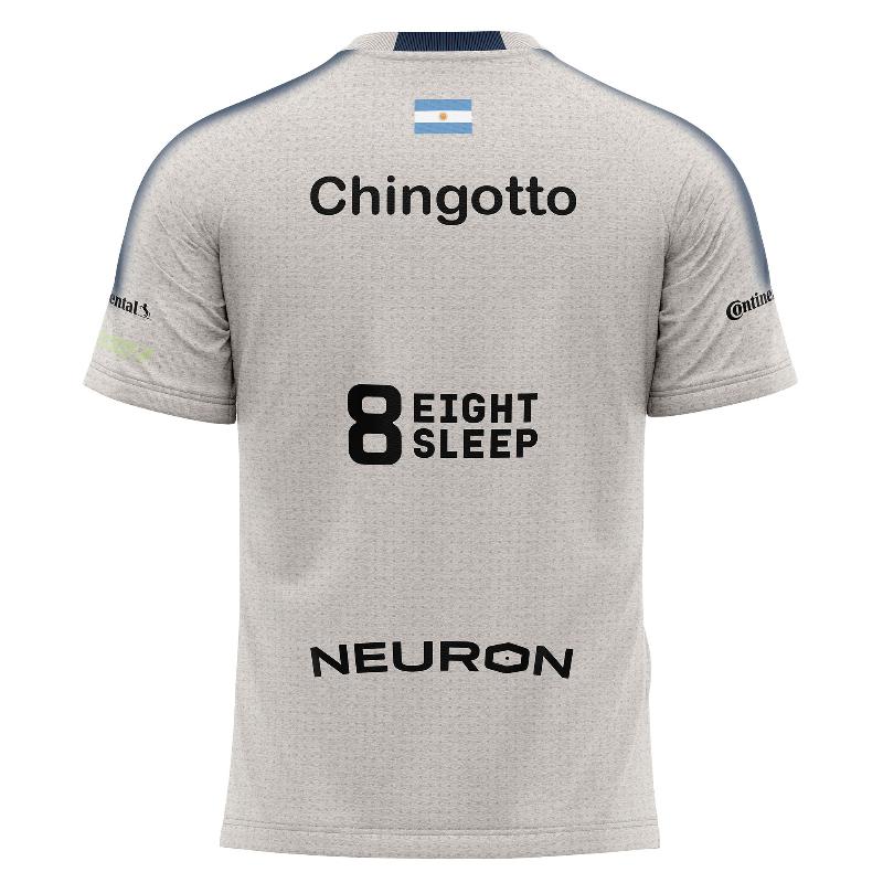 Diseño oficial Chingotto, con su nombre y la bandera de Argentina en la parte trasera, reflejando su identidad y carácter competitivo.