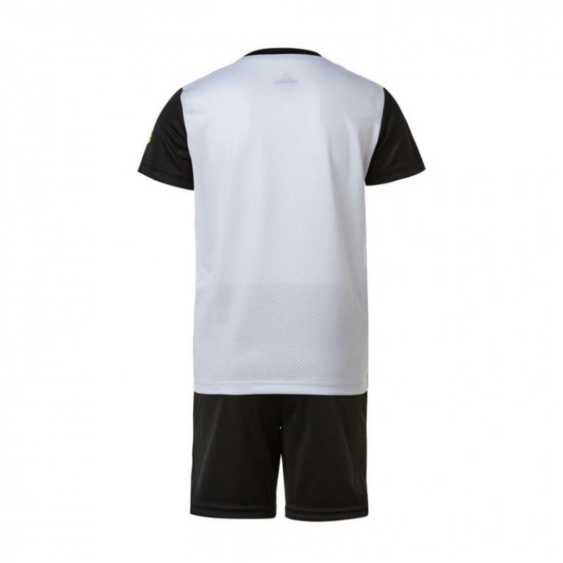 Sports shirt for children in black and white with green details, made of resistant and light fabric.
